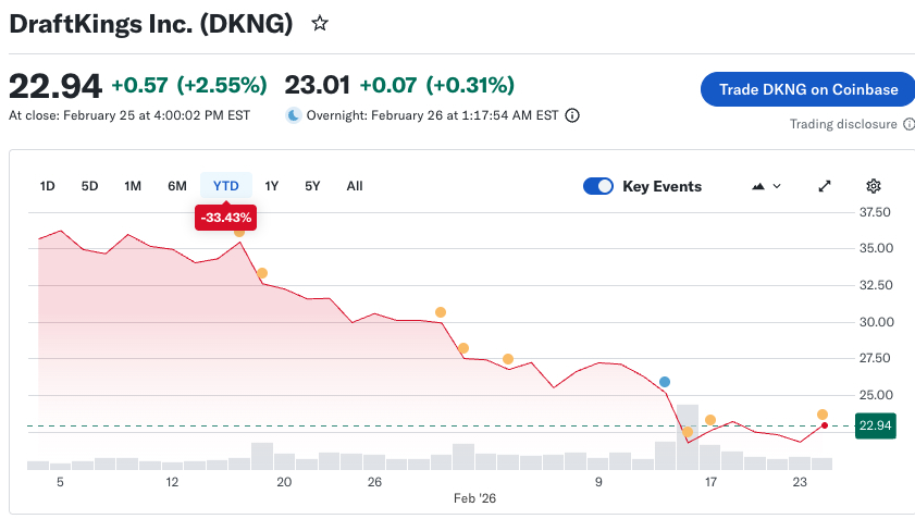 DraftKings, a prominent player in the online sports betting sector, has faced mounting challenges in early 2026. The company’s shares opened the year at around $35 but have steadily declined to the low $20s by late February. This represents a year-to-date drop of approximately 33%, exacerbating a longer-term trend where the stock is down more than 46% over the past year. Analysts point to the influx of competition from prediction markets as a key factor, with DraftKings’ management acknowledging minimal impact from rivals but investors reacting to broader market shifts.