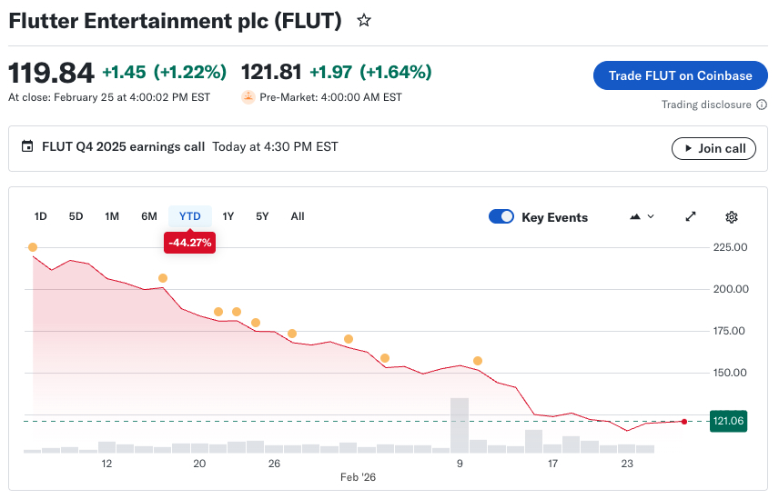 Flutter Entertainment, owner of FanDuel, has similarly struggled, with its US-listed shares dropping to around $121 by late February 2026, a 40% decline since the year’s start. The company’s broader portfolio, including international operations, has not insulated it from the US market pressures, where prediction markets have gained traction. Flutter’s stock is trading at multiples that suggest undervaluation, with some analysts seeing 30% upside potential, yet sentiment remains dampened by competitive threats.