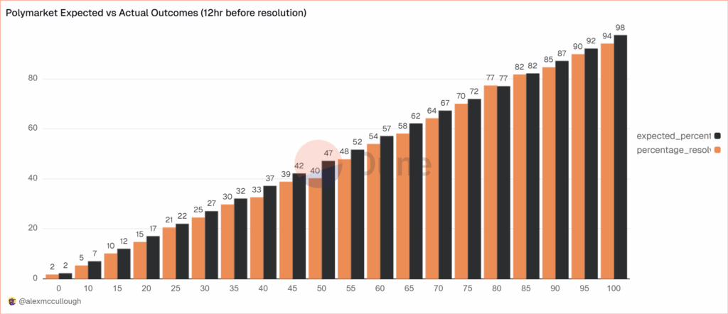 This calibration chart shows how well prediction market probabilities align with actual outcomes, with dots close to the diagonal line indicating good calibration.