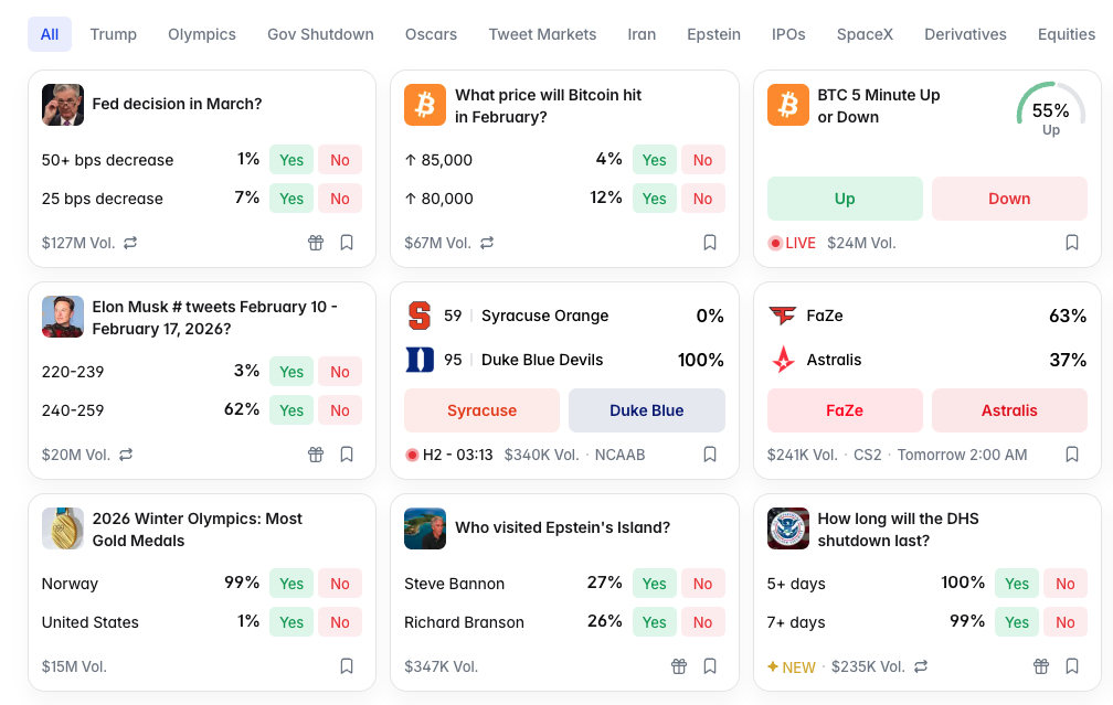This screenshot of the Polymarket interface illustrates how users view and trade on various events, with probabilities displayed prominently.