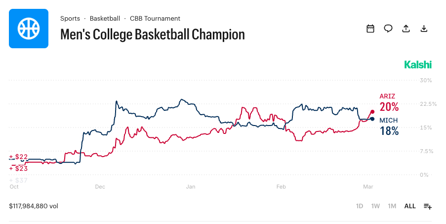 Arizona commands strong support in championship futures while Michigan trails just behind, creating intense competition that drives liquidity higher with each passing game. Traders are buying and selling these top contenders at a rapid clip, pushing combined volumes past early estimates of $60 million across major exchanges.