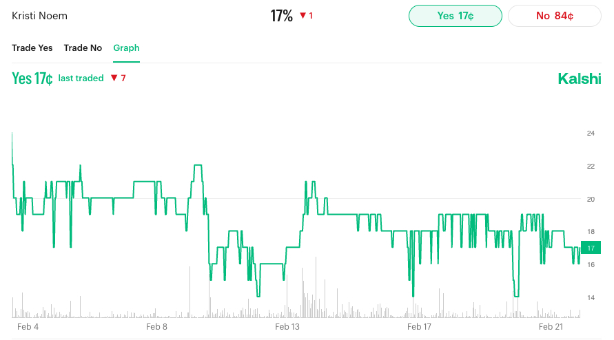 You’d think. But maybe you should rethink. Because this is some madness, imagine in your purely analytical, non-political, objective mind who Trump may ask to leave his cabinet. There are no firings, and voluntary departures typically happen after the halfway point of the terms, the midterms. Now you’re both imagining not only who might do what that would cause a layoff — as speculators are doing in this market along news event points — ICE tragedies may fall on Noem, Lutnick’s name comes out in the Epstein files, etc. — and now remind yourself, who decides on how to respond to these events? It’s not Hannity or Maddow. It’s not necessarily even rational management actors. It’s Trump and Trump alone. You’ve not only added a forecasting variable layer in the most unpredictable Chief Executive in our nation’s history. This is inherently irrational actor gaming. But there’s $1.6 million in this irrational game.