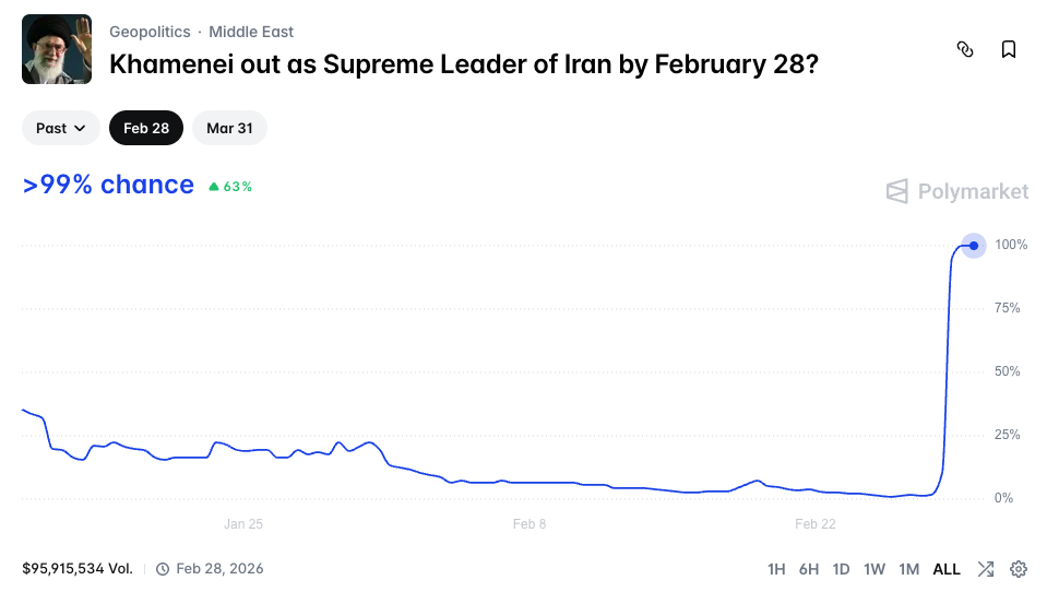 | Khamenei out by February 28? | Polymarket | $95 million | ~68% (hours before strikes) | Yes (100%) |